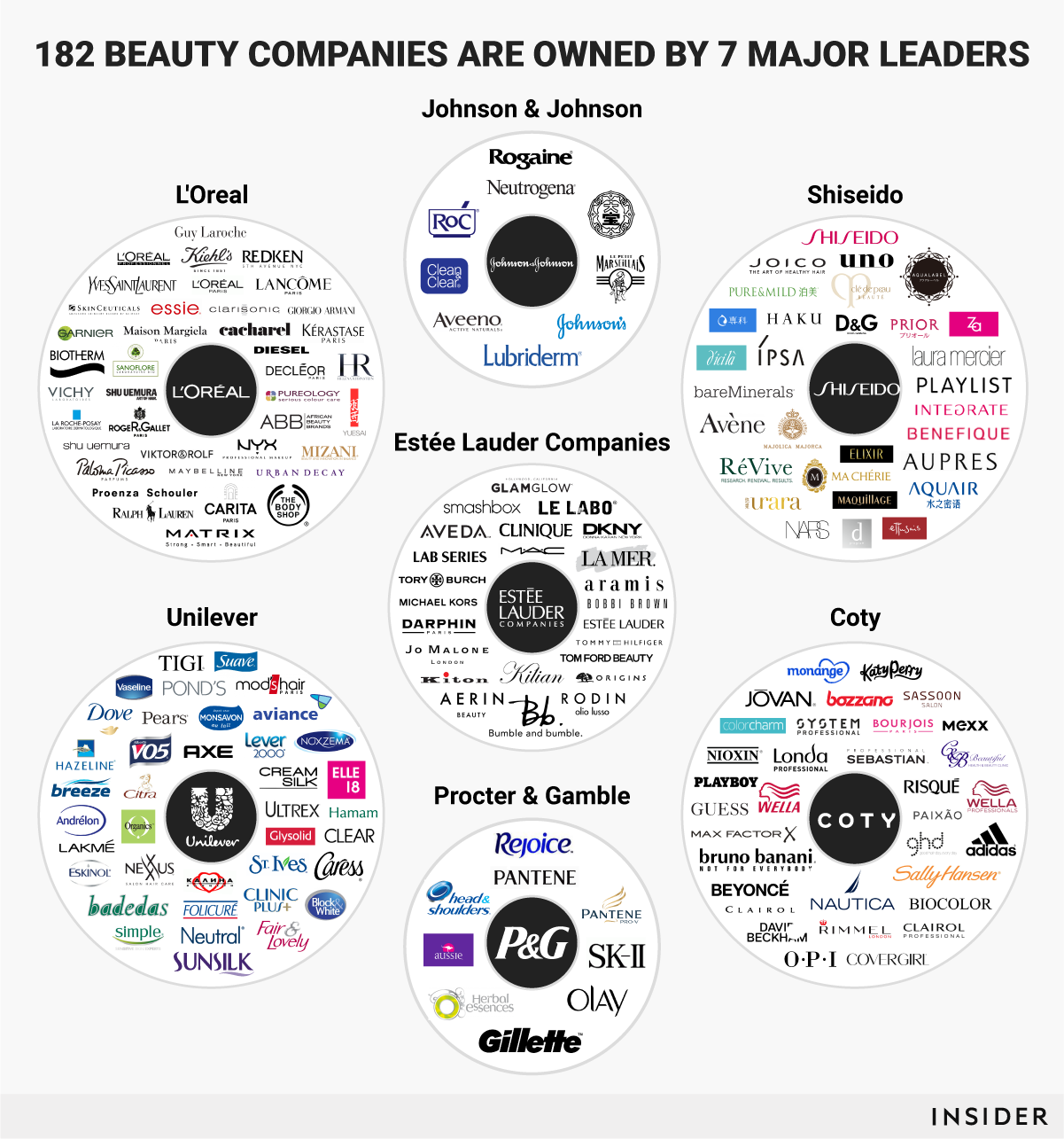 Семь крупных компаний — Estée Lauder Companies, L’Oréal, Unilever, Procter and Gamble, Shiseido, Johnson and Johnson и Coty — являются владельцами всех столь любимых нами марок (а их примерно 182). Инфографика, созданная в INSIDER, наглядно демонстрирует, к какой корпорации относятся, например, Jo Malone и Сlinique! И так ли они далеки друг от друга, как кажется…