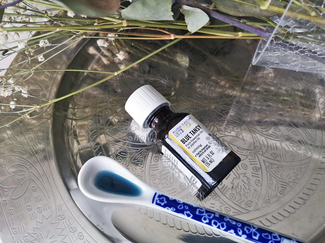 О том, чем полезна голубая пижма в косметике, и отзыв о масле голубой пижмы Aura Cacia Calming Blue Tansy oil.