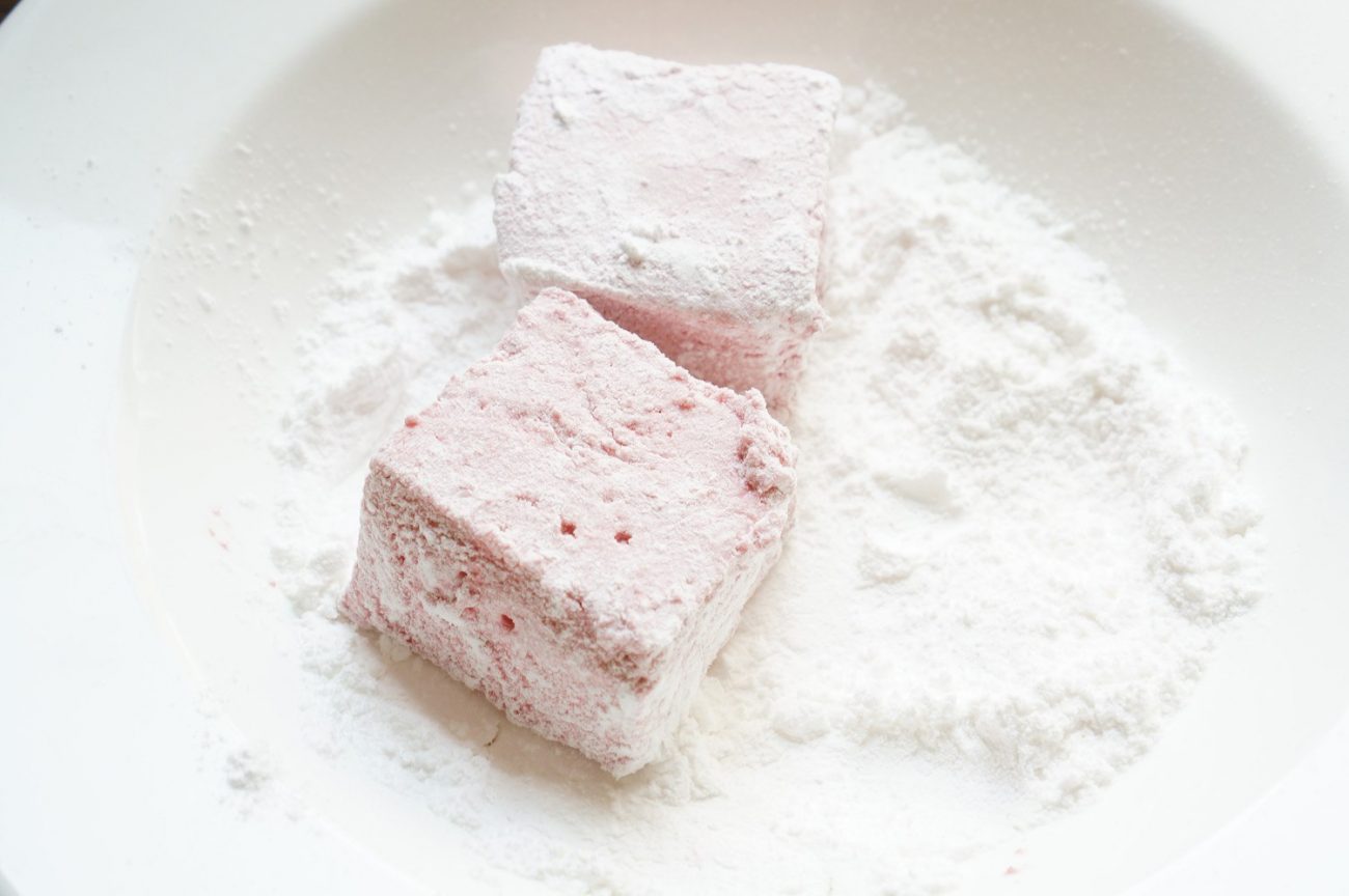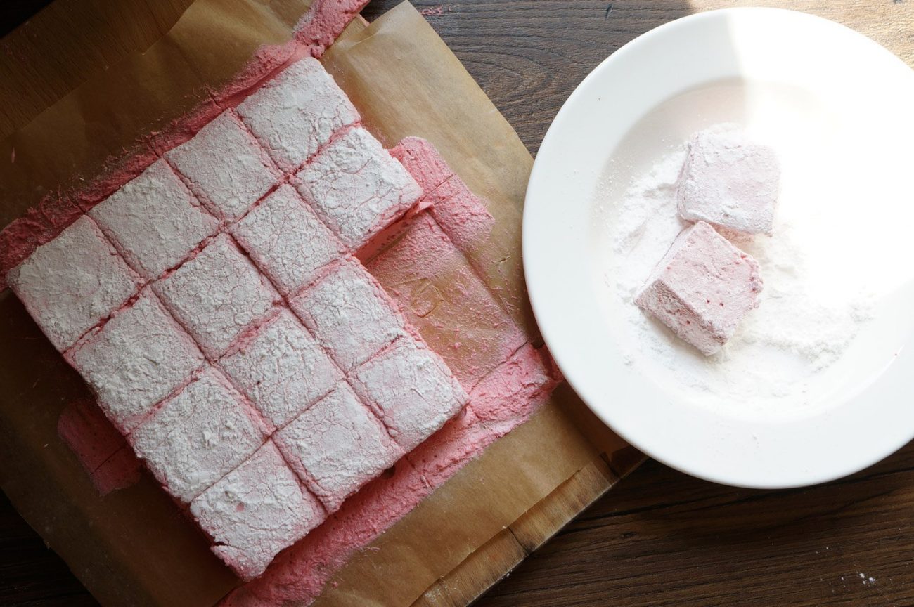 Посветлевшую и увеличившуюся в объеме смесь он переливает в форму, присыпает сахарной пудрой и оставляет на три часа. Когда маршмеллоу застынет, останется только нарезать его на небольшие квадраты и переложить на красивое блюдо.