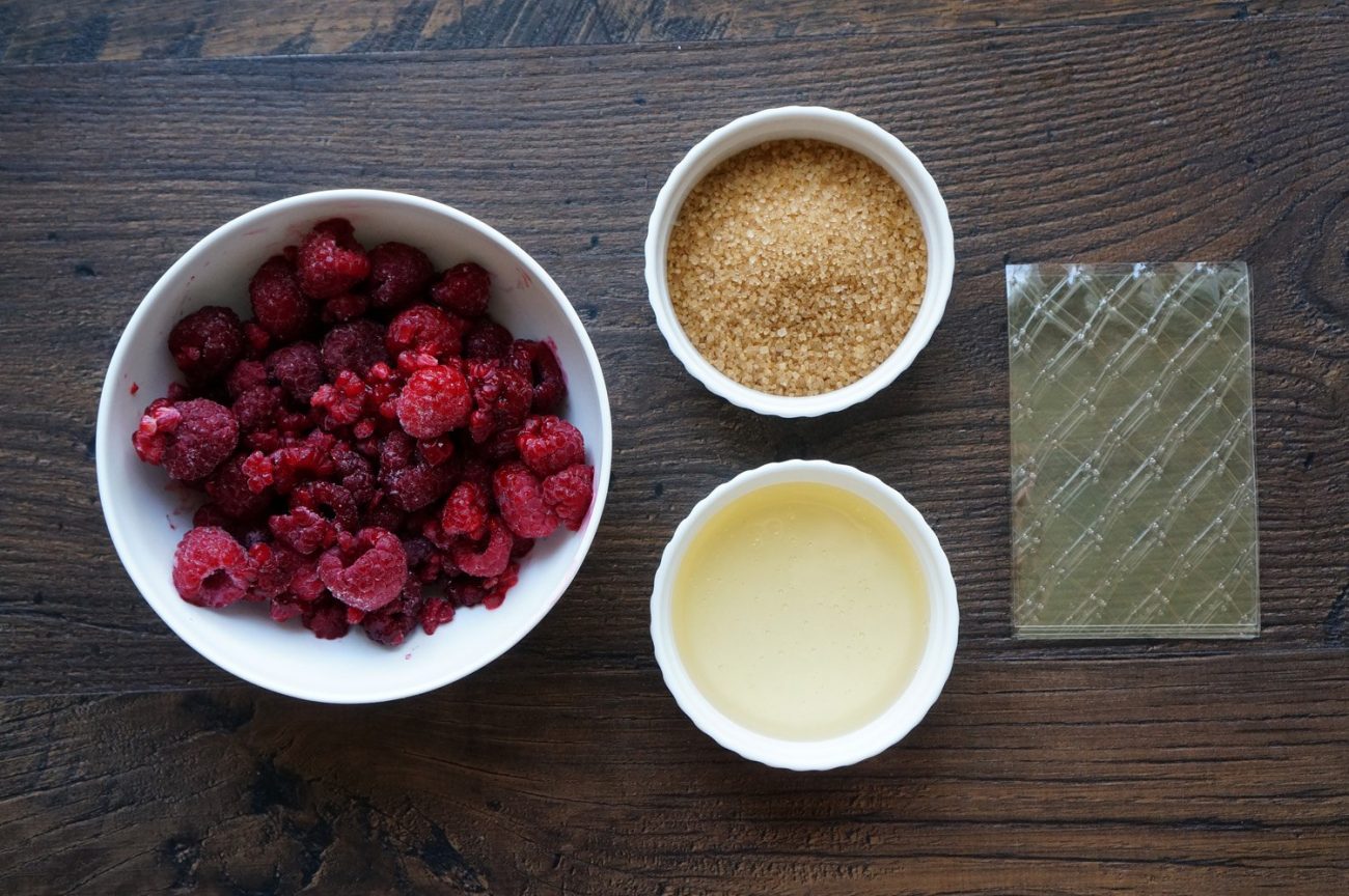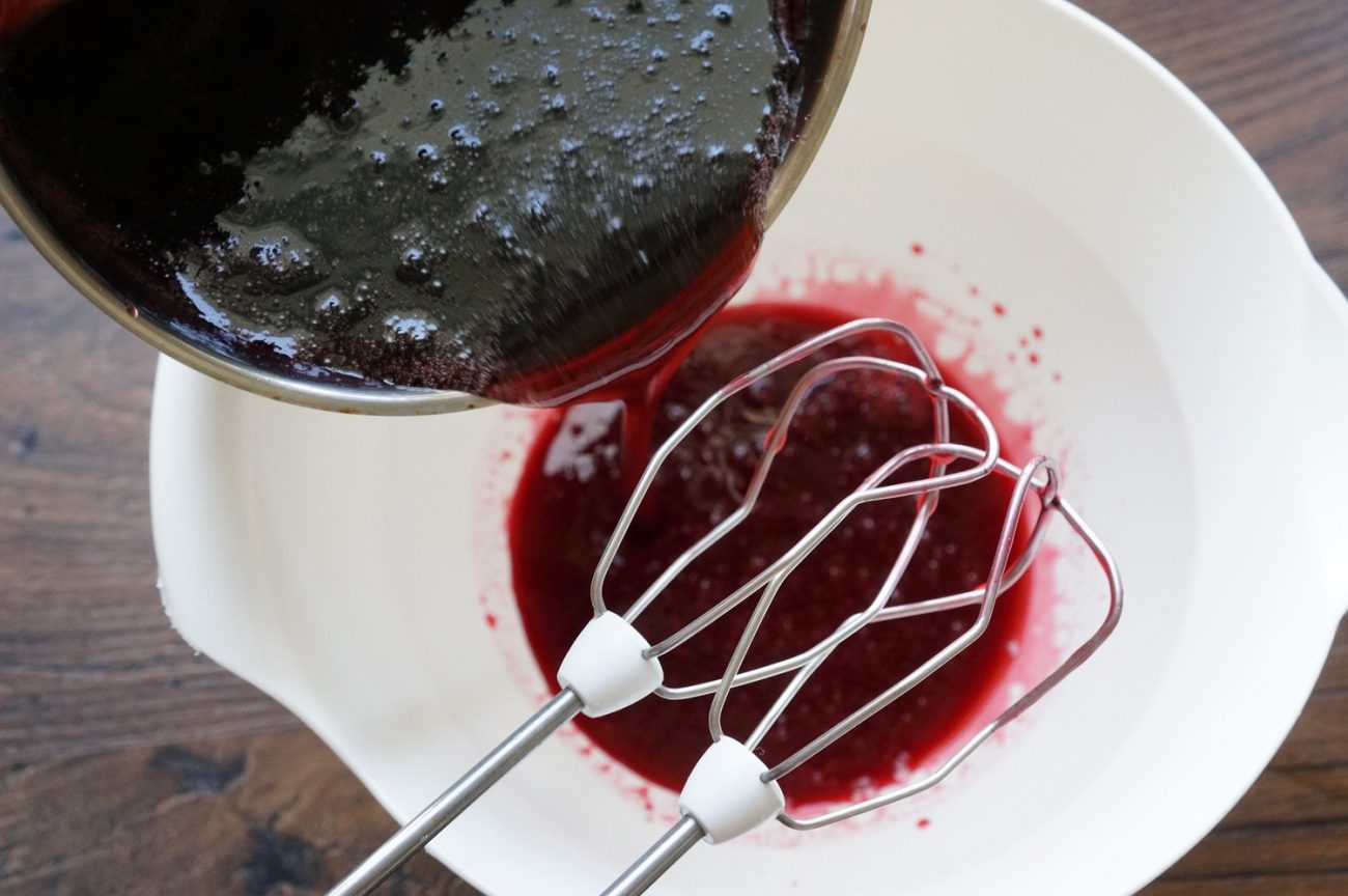 Вторым шагом Andy Chef замачивает листы желатина в холодной воде. Пока желатин «принимает ванну», наш шеф соединяет половину малинового пюре, кукурузный сироп и сахар в сотейнике и нагревает их до 110 градусов. Затем, переложив смесь в высокую миску, он добавляет желатин и, когда тот растворится, еще малинового пюре и кукурузного сиропа. Теперь все нужно тщательно взбить. Продолжая взбивать, Andy Chef вливает тонкой струйкой сироп из сотейника.