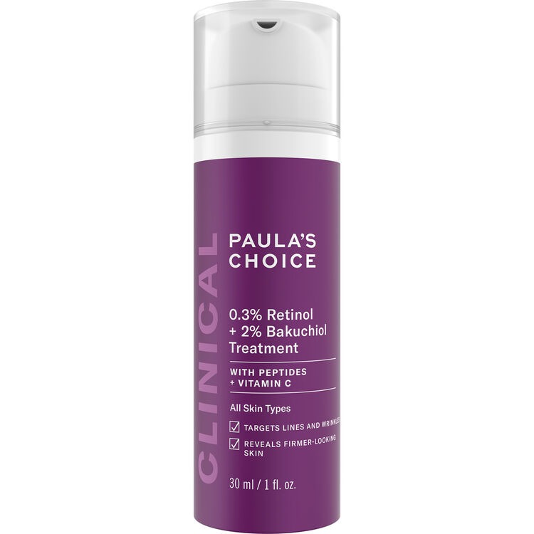 PAULA’S CHOICE 0.3% Retinol + 2% Bakuchiol Treatment — интенсивное антивозрастное средство с пептидами, витамином С, ретинолом 0,3%, керамидами и бакучиолом 2%. Сыворотка должна разглаживать морщины и повышать упругость кожи. Это средство можно использовать и летом тоже (но не на отдыхе у моря, и не забывайте о защите от солнца днем обязательно).