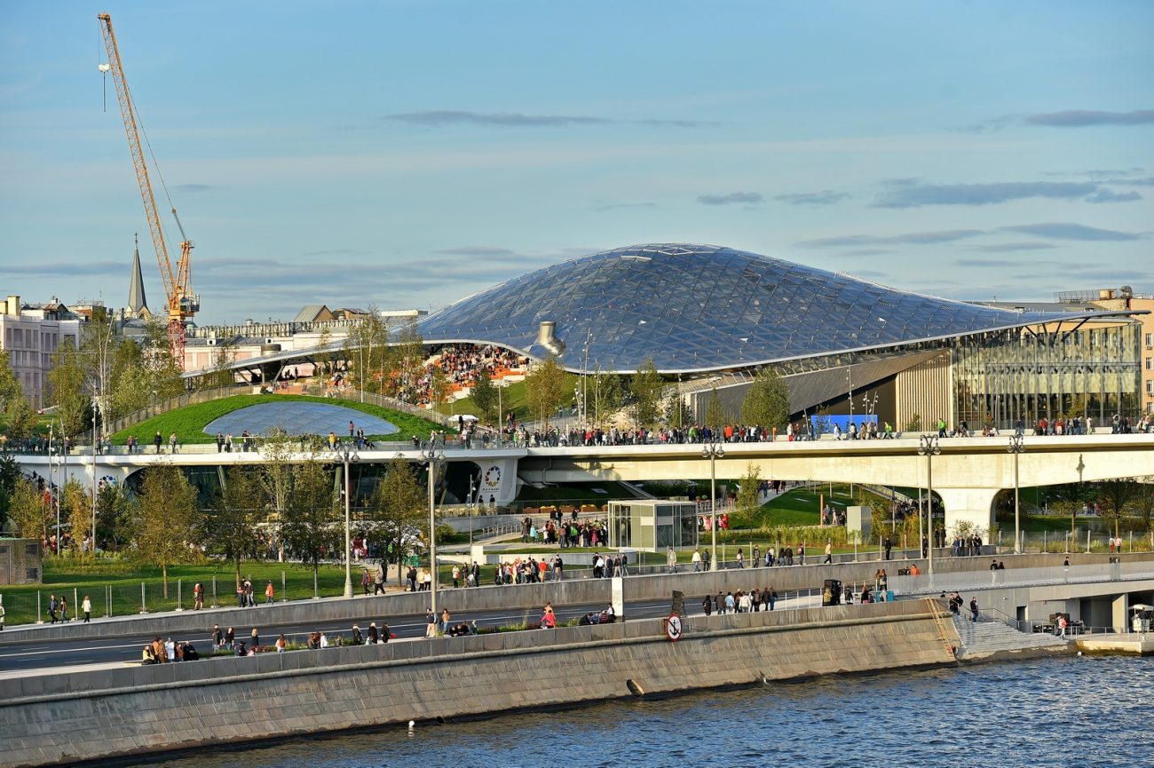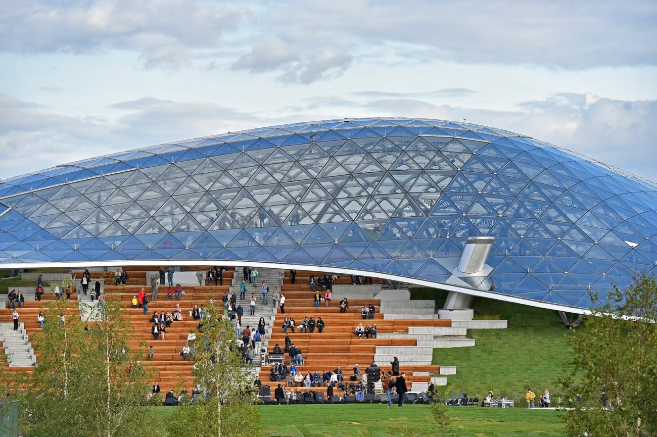 Конечно, первое, что бросается в глаза – парящий над Москвой-рекой мост и гигантский амфитеатр, накрытый сверху стеклянным куполом. Конструкция, напоминающая панцирь черепахи, создает особый климат, что позволяет проводить на площадке мероприятия круглый год, а также выращивать редкие растения.