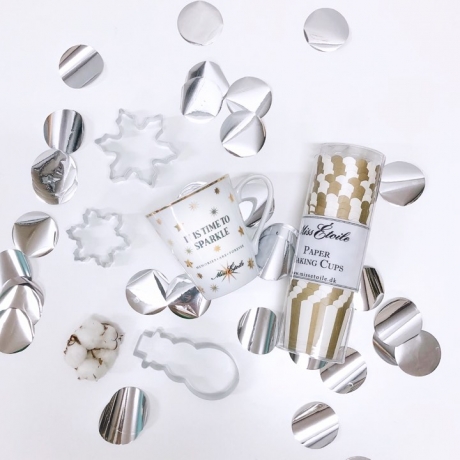 В набор входят кофейная кружка с надписью «It is time to sparkle», формы для выпечки в виде снеговика и снежинок, бумажные формочки для капкейков в золотую полоску и конфетти — все, чтобы создать праздничное настроение!