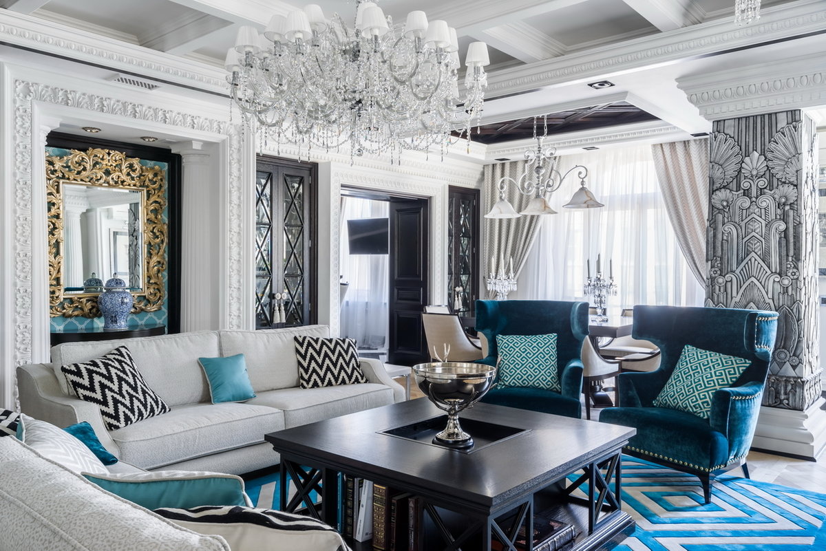 Широко используют «драгоценные цвета» – сапфировый, золотой, изумрудный и рубиновый – для создания акцентов. Но нужно помнить, что ар-деко не приемлет кричащие кислотные цвета.