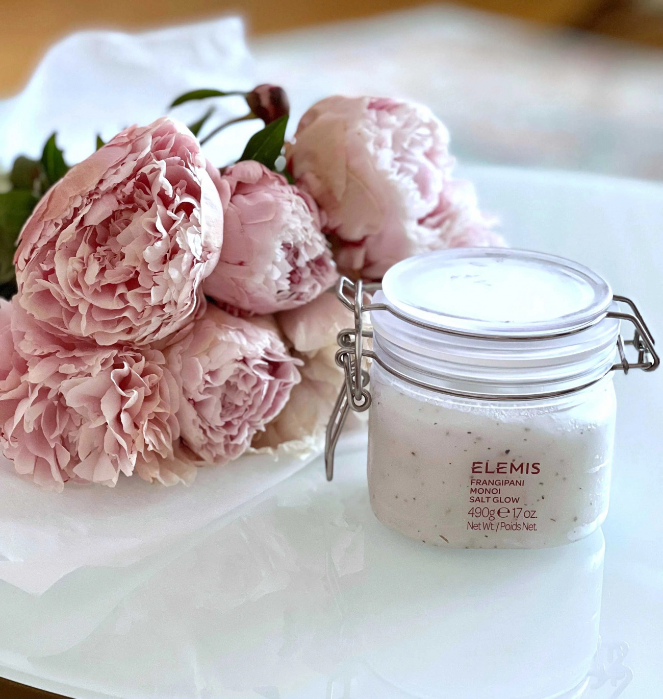 Краткий отзыв на нежный солевой скраб ELEMIS Frangipani Monoi Salt Glow с ароматом франжипани и монои от бьюти-блогера Марины Дареас.