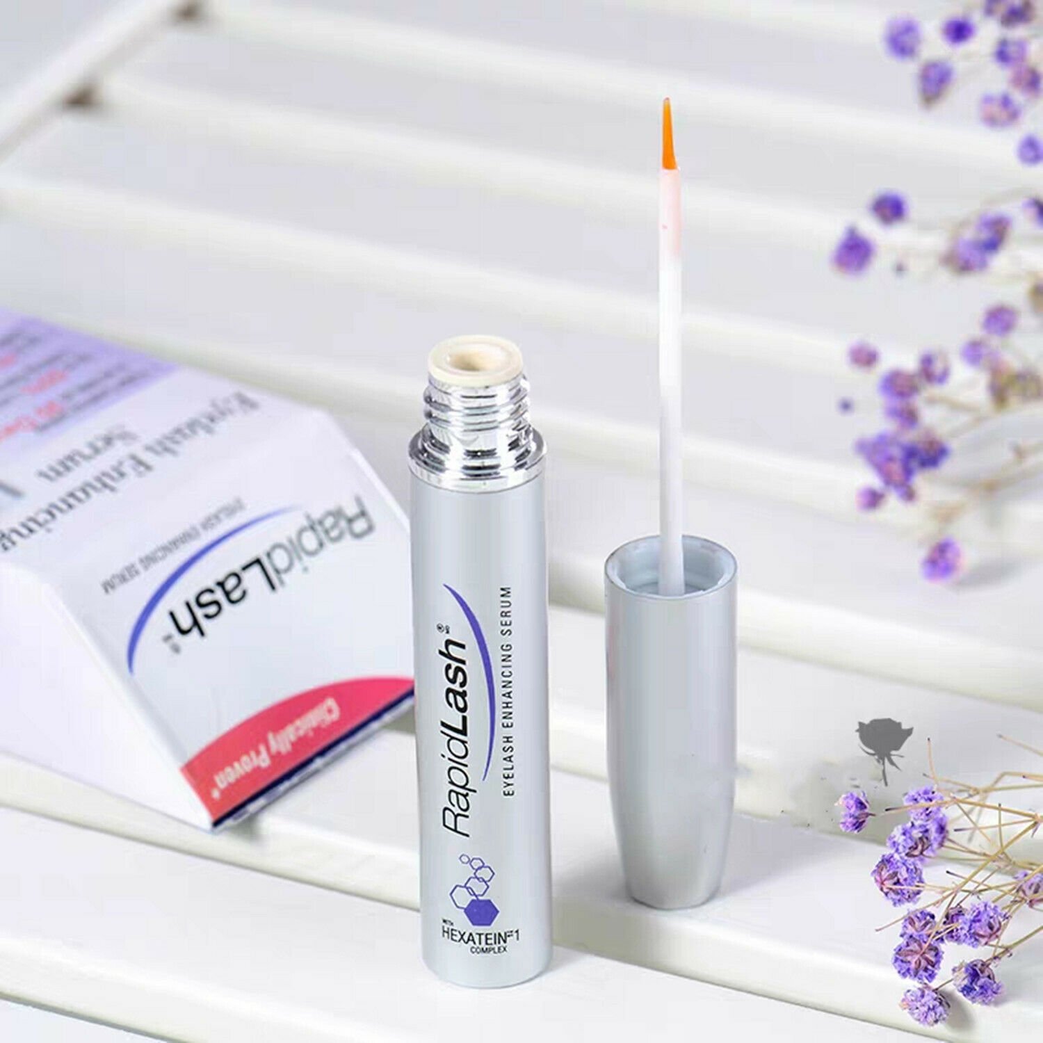 Сыворотка для роста ресниц RapidLash Eyelash Enhancing Serum содержит запатентованный комплекс Hexatein 1, который состоит из шести компонентов — пантенол, полипептиды, биотин, аминокислоты, соевое масло и экстракт тыквенных семечек — и направлен на восстановление, питание, укрепление, увлажнение и придание блеска ресницам.