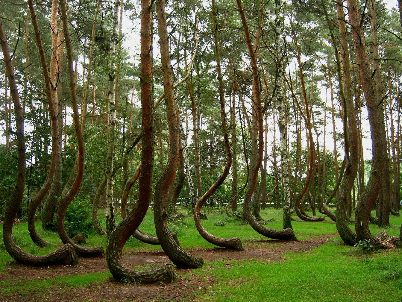 Название говорит само за себя — лес действительно кривой. Точнее, деревья в нем. По неизвестной причине около 400 сосен примерно на высоте 10 см от земли начинают изгибаться в невероятном танце — у основания стволы деревьев образуют симметричные ряды из «полумесяцев». Все они обращены в своих движениях на север, что только добавляет Кривому лесу таинственности.