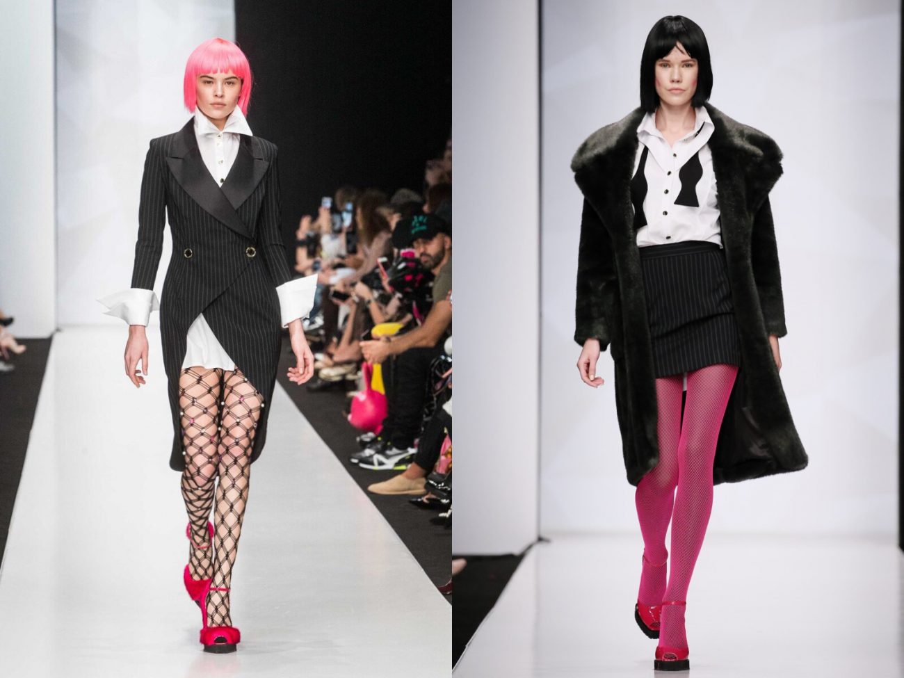 Головы моделей также украшали парики ярко-розовой цветовой гаммы: от фуксии до глубокого фиолетового цвета.