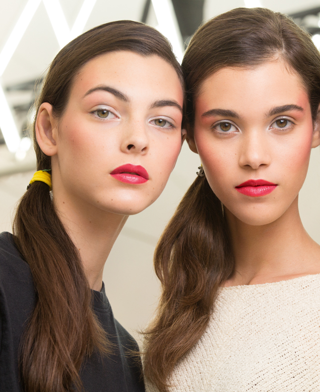 Еще один фаворит этого сезона – красная помада. Красный может быть классическим, ярко-алым, коралловым или кирпично-морковным. Самые актуальные текстуры: матовые, сатиновые и лаковые. Красная помада самодостаточна сама по себе, необходимо лишь создать ровный тон и слегка подчеркнуть глаза и брови.